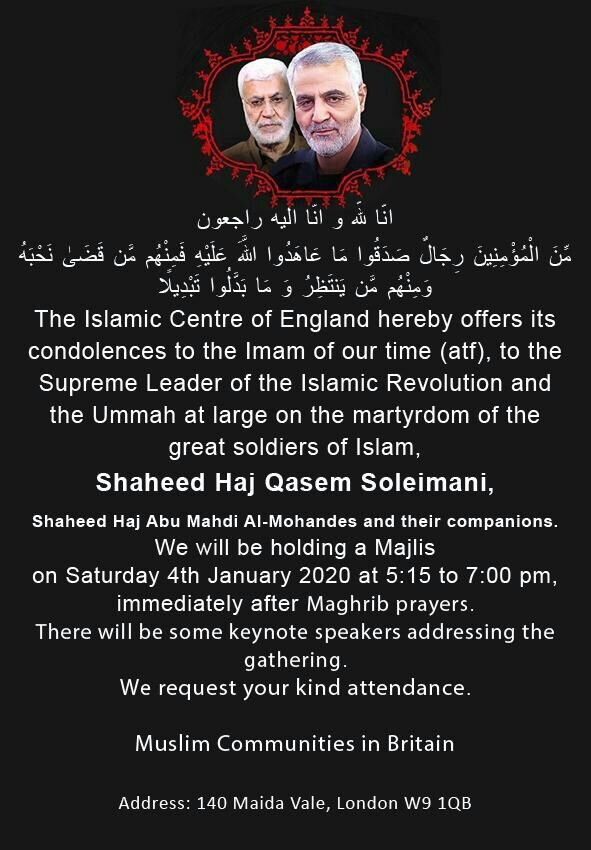 All Stories / 4 January 2020 - 20:09 News ID: 359640 Short URL Download photos Majles Ta'been of Shahid Qasem Soleimani, Shahid Haj Abu Mahdi Al-Mohandes and their companions 5.15 PM at Islamic center of England Tags Qasem Soleimani Abu Mahdi Al-Mohandes Islamic center of England Hawzah News Agency